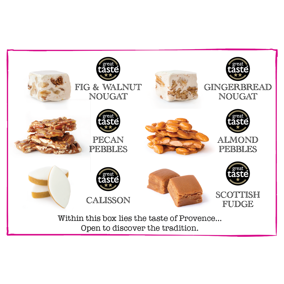 Our Noël House Box celebrates the Provençal tradition of the Thirteen Desserts of Christmas (les treize desserts de Noël), when families gather after midnight mass to share symbolic sweets — from nougat and figs to nuts and calissons.